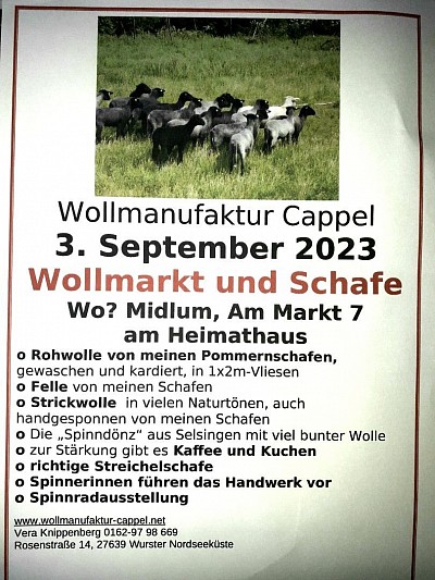 Der diesjährige Wollmarkt mit meinen Schafen und der Spinngruppe des Heimathauses Midlum findet am 31.August 2025 statt. Wie immer mit Verkauf der guten Pommernwolle und diverser Strickwolle, handgesponnen von meinen Schafen und auch maschinengesponnen.